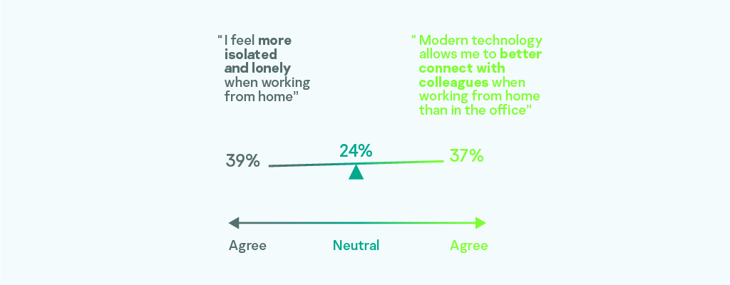 在家工作似乎对健康也有好处,67%的受访者表示在远程工作时感觉更舒服,或者没有注意到由于加班而导致的焦虑增加。然而,与同事保持距离而感到不舒服的工人比例仍然相当大,36%的受访者说他们感到更累,33%的受访者报告说他们在家里工作时有更多焦虑。
