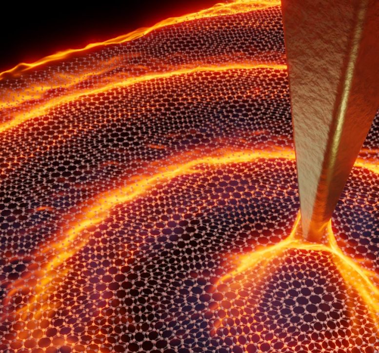 一个国际研究小组在《自然-物理学》上报告了当红外光照射时,光和电子如何在材料中协同运动。当两层石墨烯一层放在另一层上面,并在它们之间扭曲一个非常小的角度时,就会形成一个"摩尔纹",事实证明该系统的物理特性会发生巨大的变化。特别是,在1度的"神奇"角度附近,电子的速度急剧下降,有利于电子之间的相互作用。这种相互作用在扭曲的双层石墨烯中产生了一种新型的超导性和绝缘性相。