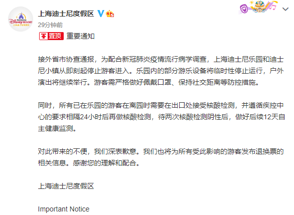 10月31日晚,上海迪士尼度假区官方发布公告,即刻起停止游客进入。公告称,接外省市协查通报,为配合新冠肺炎疫情流行病学调查,上海迪士尼乐园和迪士尼小镇从即刻起停止游客进入。乐园内的部分游乐设备将临时性停止运行,不过,户外演出将继续举行。