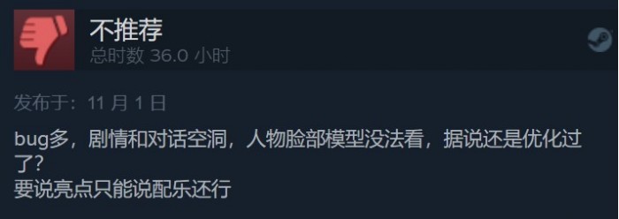 从10月31日到11月1日的差评来看,玩家吐槽的根本问题还是游戏的剧情和不尽如人意的战斗,以及非常多的BUG。玩家表示游戏的剧情和对话很空洞有很多突兀的地方,平淡无奇。更有玩家表示《仙剑奇侠传七》的战斗虽然说跳出了回合制,但是本质还是回合制,战斗没有爽快感。