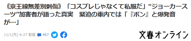 东京突发地铁伤人嫌犯被疑COS小丑 自称只是日常服装