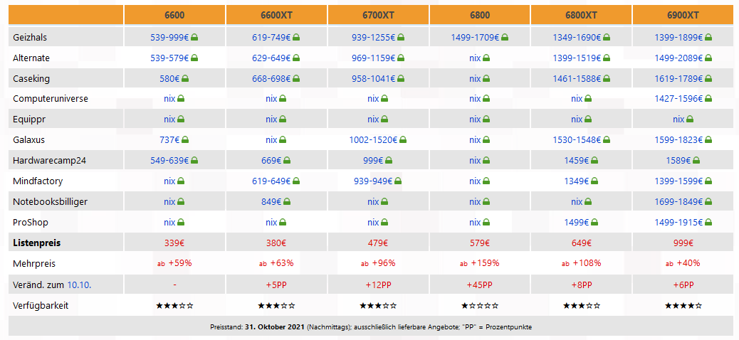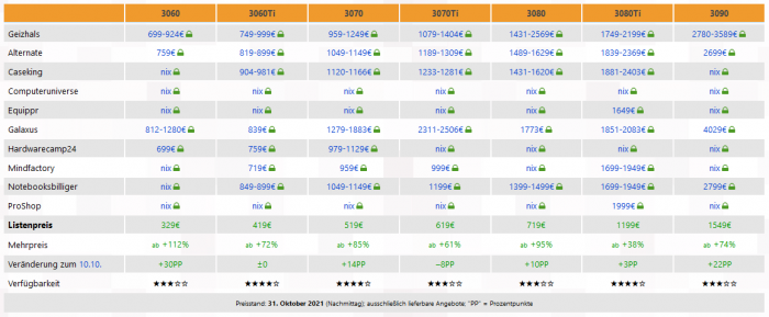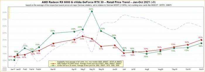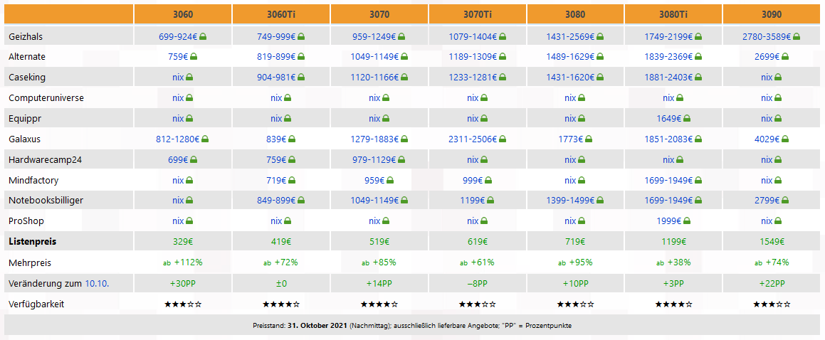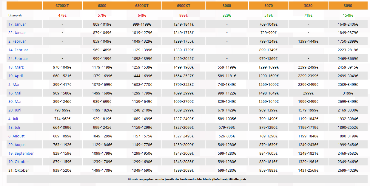 3DCenter 指出,目前的市场情况远非健康。一些削减的型号,如 Radeon RX 6800和RX 6800 XT,可以找到比旗舰产品 RX 6900 XT 更高的价格。在极端情况下,NVIDIA 型号,如 GeForce RTX 3070 Ti 的价格高于 2000 欧元,GeForce RTX 3090 价格高达 4029 欧元。