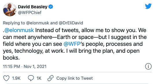 比斯利的这条推文是在回应马斯克在周末发出的呼吁。马斯克上周日在Twitter上回应被比斯利要求捐款一事时称,如果联合国世界粮食计划署能够详细解释如何使用60亿美元来解决全球饥饿问题,他会马上出售特斯拉股票。马斯克还要求使用透明和公开的会计方法,以便公众能够看到“钱究竟去哪了”。