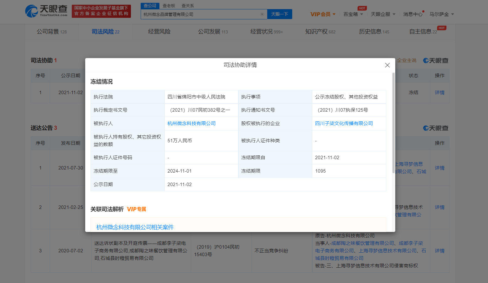 天眼查App显示,近日,杭州微念品牌管理有限公司新增股权冻结信息,股权数额51万人民币,股权被执行的企业为四川子柒文化传播有限公司,执行法院为四川省绵阳市中级人民法院。股东信息显示,四川子柒文化传播有限公司由杭州微念品牌管理有限公司和李子柒共同持股,其中微念公司持股51%。