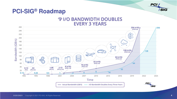 PCIe 6.0的标准预计今年底完成,根据PCI-SIG组织的信息,它的传输数据率最高64GT/s,x16带宽(双向)可达256GB/s,两倍于PCIe 5.0。