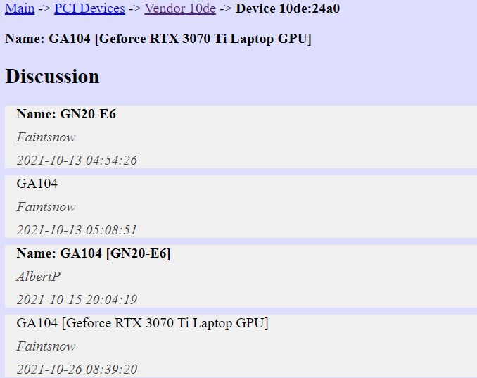 消息称 NVIDIA 正为笔记本市场开发两款新的移动 GPU,其中一款就是最近传闻中的 GeForce RTX 3070 Ti。近日网友在 PCI Device ID 数据库中发现了一个新的 GA104 芯片。 根据网友 Faintsnow 爆料评论,科技媒体 VideoCardz 在 PCI Device ID 数据库上发现了一个特别的 ID-- ID 24A0,指的是 NVIDIA 尚未发布的移动 GPU--NVIDIA GN20-E6。