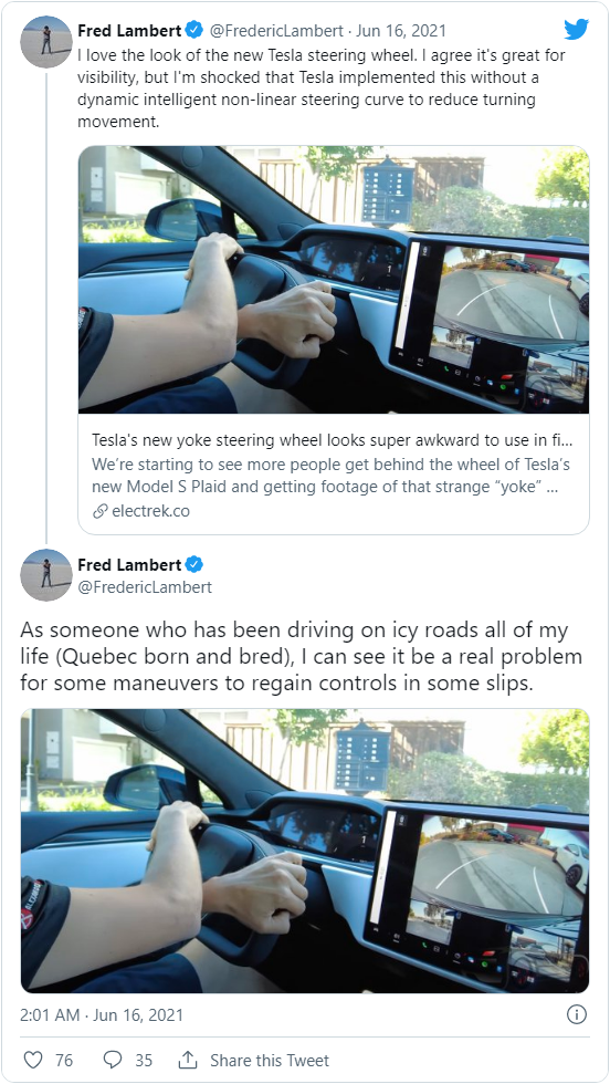 作为 Model S Plaid 的早期车主这一,Ryan Huber 表示随着时间的推移,自己已在一定程度上习惯了轭式方向盘的操控体验。