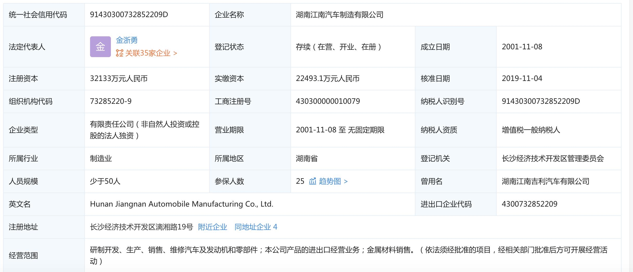 江南汽车成立于2001年11月8日,注册资本为3.2亿元,法定代表人为金浙勇,经营范围包含研制开发、生产、销售、维修汽车及发动机和零部件等。