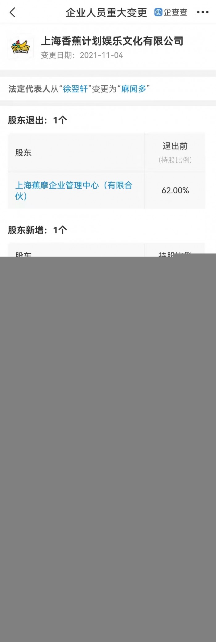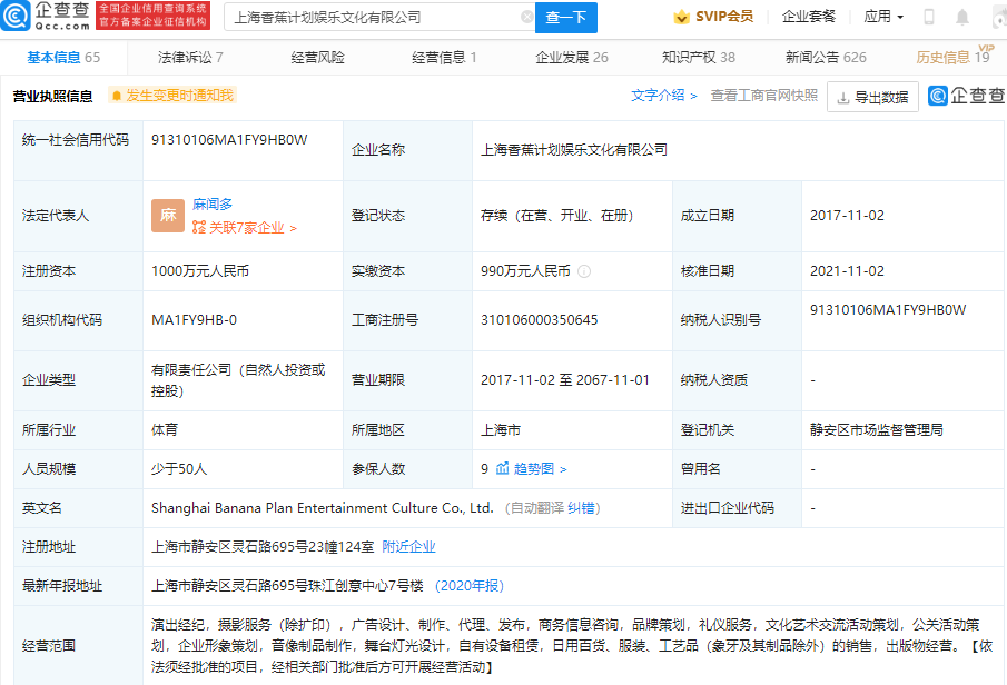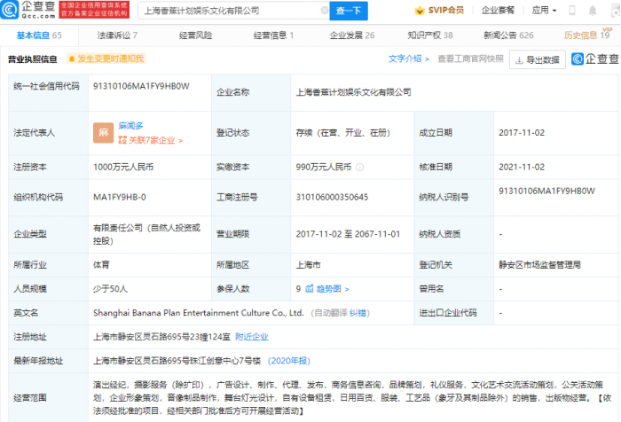 企查查APP显示,11月2日,香蕉娱乐关联公司上海香蕉计划娱乐文化有限公司发生工商变更,王思聪退出董事长职务,由麻闻多接任,同时法定代表人由徐翌轩变更为麻闻多。企查查信息显示,香蕉娱乐是音乐及艺人经纪服务商,公司成立于2017年,注册资本1000万元人民币。