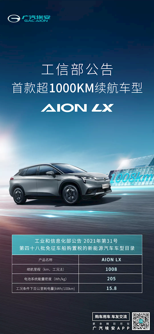 11月6日,广汽埃安发布公告称,进入工信部最新一批新能源汽车推广目录的埃安(AION)GAM6480BEVB0P纯电动车型,即采用了海绵硅负极片电池技术、全球首次实现续航超1000km的纯电车型AION LX,并将在今年广州车展上亮相。