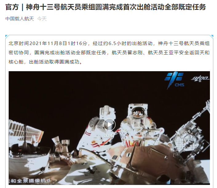 据中国载人航天工程办公室消息,北京时间2021年11月8日1时16分,经过约6.5小时的出舱活动,神舟十三号航天员乘组密切协同,圆满完成出舱活动全部既定任务,航天员翟志刚、航天员王亚平安全返回天和核心舱,出舱活动取得圆满成功。