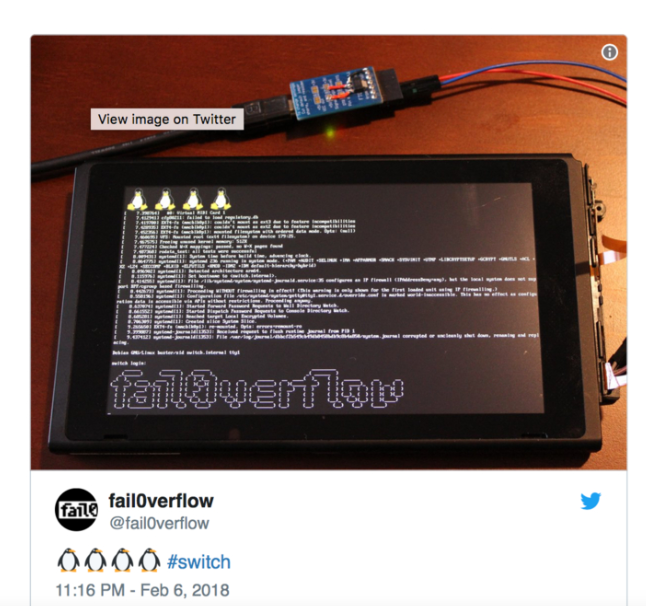 Fail0verflow在2015年最后一天,宣布成功破解PS4游戏主机,他们发现集成AMD Radeon的GPU上存在的破损NOP指令使其可运行Gentoo Linux操作系统,并且在32c3开源会议上演示了整个破解过程。他们还在2018年2月宣布破解了Switch,他们发现Nividia Tegra X1系统的boot ROM上存在漏洞,在Switch游戏设备启动的时候,利用程序能够触发ROM中的漏洞,他们利用这个漏洞成功安装并运行了Debian Linux发行版。