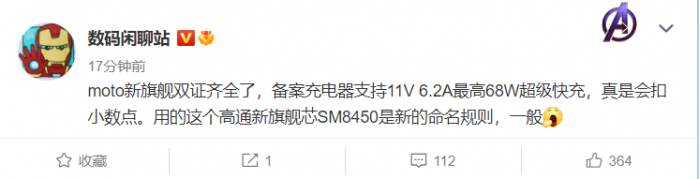 刚刚,该爆料者又带来了关于该机的最新消息,他透露:“moto新旗舰双证齐全了,备案充电器支持11V 6.2A最高68W超级快充,真是会扣小数点。用的这个高通新旗舰芯SM8450是新的命名规则”。