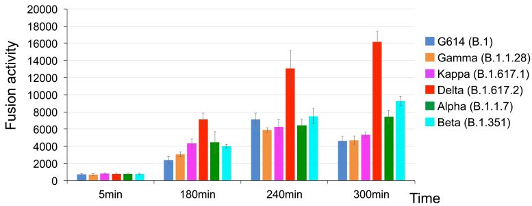 陈冰和他的同事使用两种基于细胞的检测方法,证明Delta变体的刺突糖蛋白特别擅长膜融合。这使得模拟的Delta病毒能够比其他五种SARS-CoV-2变种更快、更有效地感染人类细胞。当细胞中ACE2受体的数量相对较少时,情况更是如此。