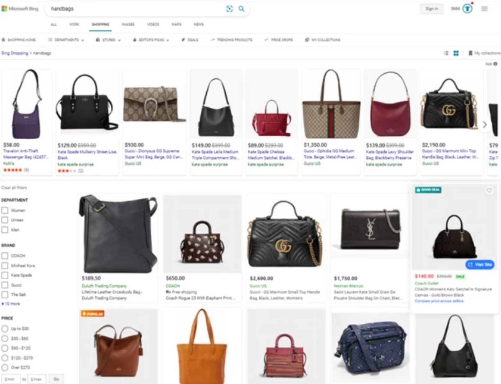 微软必应(Bing)推出了以购物为重点的新功能,它将节省购物者的时间和金钱并帮助他们做出正确的购买决定。现在,当用户在必应上搜索产品时可以获得关于商品受欢迎程度、多个商店的价格和交易的见解。此外,还会有一个新的简化结账流程。