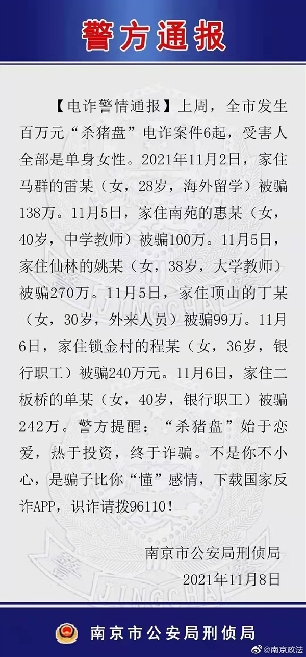 近些年,电信诈骗、网络诈骗相当猖獗。虽然国家和有关方面一直在不遗余力地打击诈骗、宣传反诈常识,但一方面骗子花招不断翻新,另一方面很多人仍然缺乏足够的自我保护意识,即便是一些高级知识分子也经常被骗。据南京市委政法委最新通报,仅仅在上周,南京全市就发生百万元及以上“杀猪盘”电信诈骗案件6起,受害人全部是单身女性,其中一名大学教师被骗多达270万元。