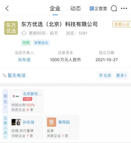 企查查APP显示,东方优选(北京)科技有限公司成立于2021年10月27日,注册资本1000万元人民币,经营范围含销售食用农产品;食品互联网销售;广播电视节目制作经营;网络文化经营等。该公司由北京新东方迅程网络科技股份有限公司全资持股,俞敏洪为最终受益人。