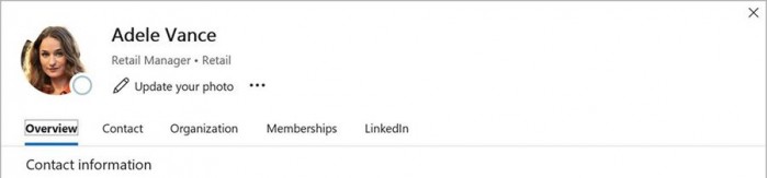 Outlook 用户还可以在他们的地址簿中快速搜索姓名、职务、位置、电话号码和其他字段。用户还可以使用个人资料卡中的链接更新他们的个人资料照片。