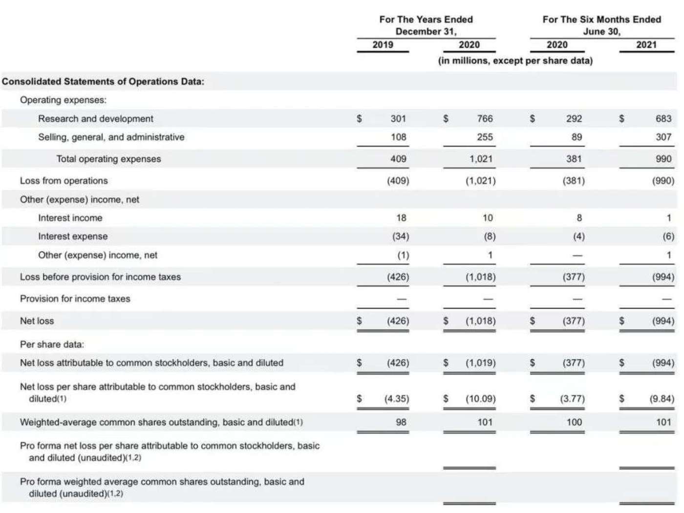 虽然Rivian看似前景一片美好,但并非没有生存危机。与Lucid公司一样,Rivian也存在着巨额亏损与产能危机。根据Rivian提交的招股书,其在2019年、2020年的净亏损分别为4.26亿美元、10.18亿美元;而今年上半年,Rivian的净亏损更是跃升到9.94亿美元。
