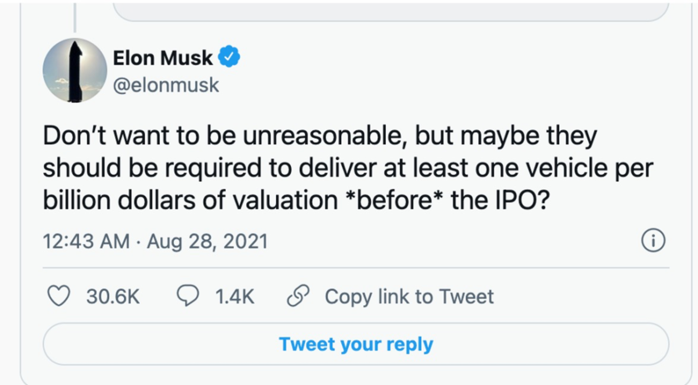 Rivian是不是特斯拉最大劲敌?当然是,就连马斯克也忍不住寂寞,在Rivian上市前就跑出来调侃一番,“或许应该要求他们在IPO之前,每10亿美元的估值至少交付一辆汽车”,Rivian的威胁可见一斑。