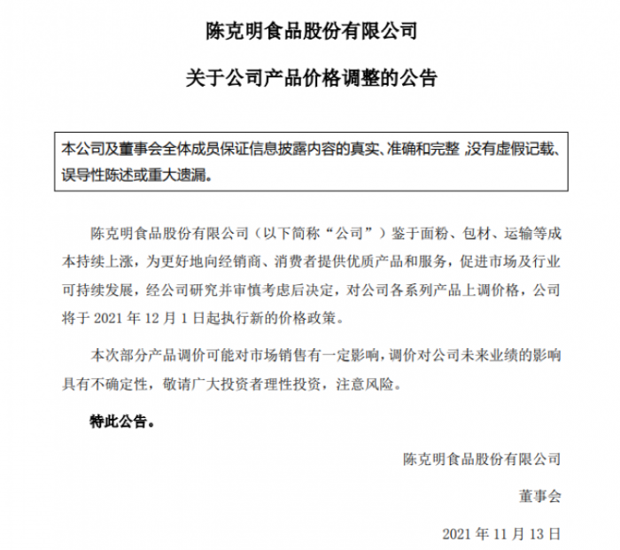 克明食品在公告中称,鉴于面粉、包材、运输等成本持续上涨,为更好地向经销商、消费者提供优质产品和服务,促进市场及行业可持续发展,经公司研究并审慎考虑后决定,对公司各系列产品上调价格,公司将于2021年12月1日起执行新的价格政策。