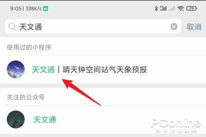 1. 打开微信,点击右上角的搜索图标,搜索“天文通”小程序。