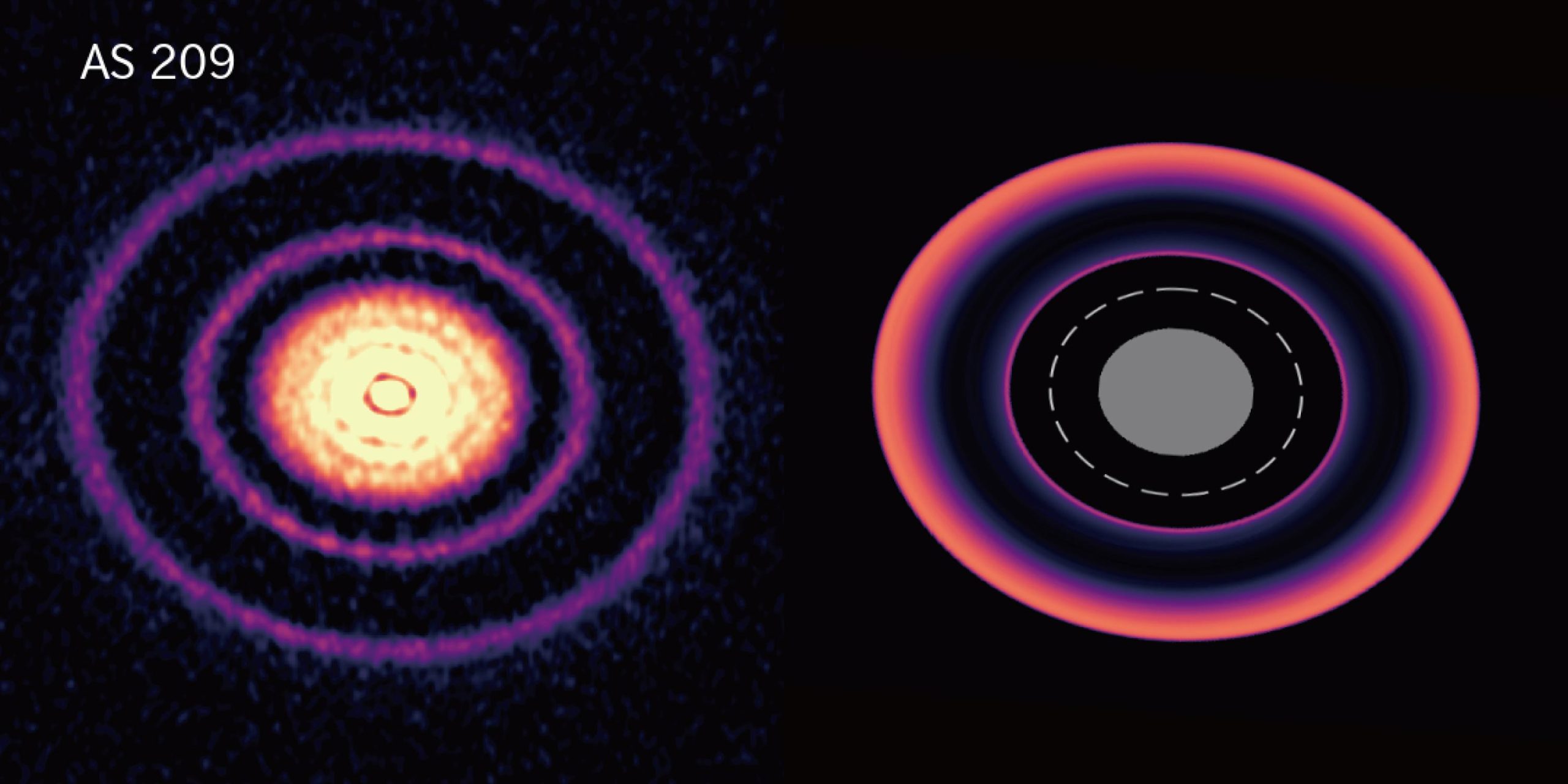 年轻的恒星被气体和尘埃的原行星盘所包围。世界上最强大的射电望远镜阵列之一,ALMA(阿塔卡马大型毫米/亚毫米阵列)已经在这些原行星盘中观察到了密度较大和密度较小的环和间隙的各种模式。行星盘中形成的行星的引力效应是解释这些结构的一个理论,但是寻找环附近的行星的后续观测基本上没有成功。