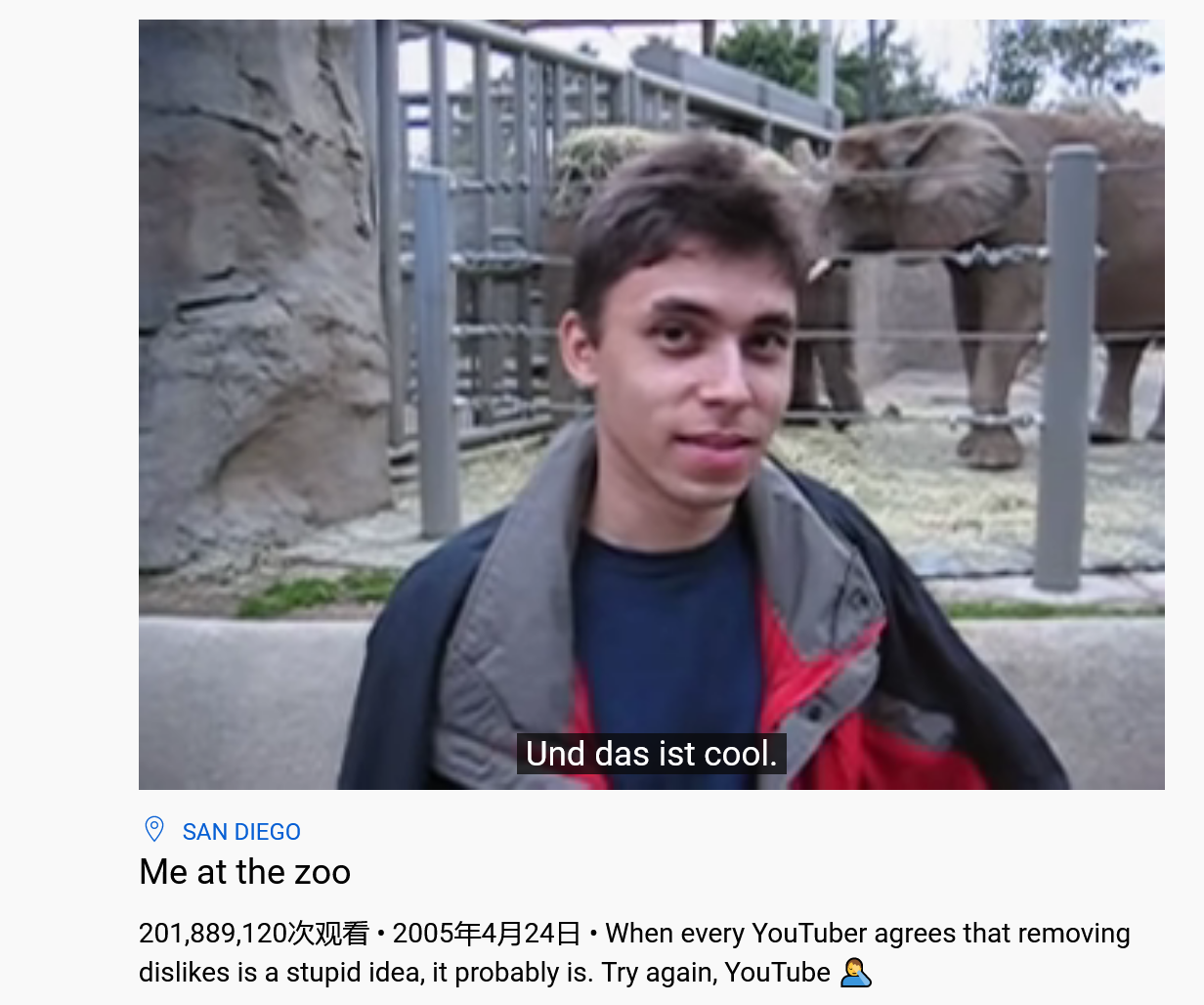 与此同时,“我在动物园”的YouTube描述也更新了几次。在开始时,它的是“在 YouTube上的第一个视频,于2005年4月23日星期六晚上8点27分上传。该视频由Yakov Lapitsky在圣地亚哥动物园拍摄。”