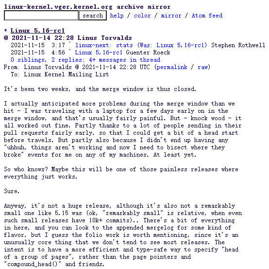 Linus Torvalds 刚刚宣布了 Linux 5.16-rc1,可知在跨过了本次激动人心的合并窗口之后,贡献者们为新版 Linux 修复了大量内核错误。新功能方面,Linux 5.16 包含了正在合并的 Memory Folios 方案、DAMON 内存回收、各种文件系统改进。
