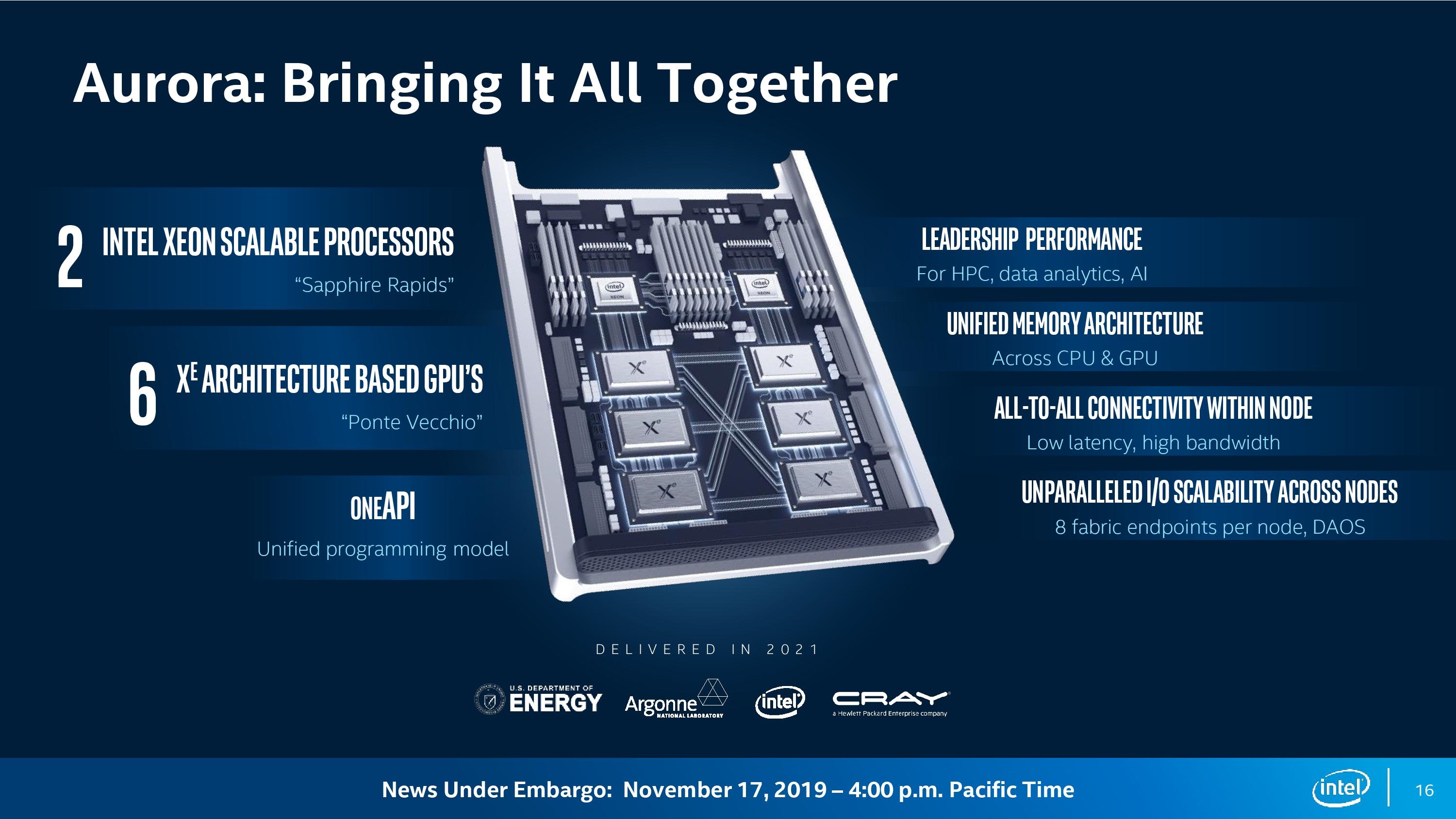 Aurora超算的每个节点有两颗Sapphire Rapids处理器、六块Ponte Vecchio加速卡,后者通过Xe Link高速总线两两彼此互连。