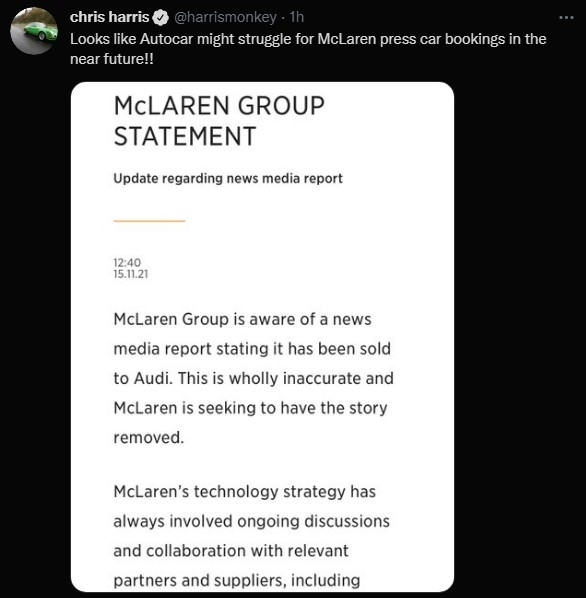 迈凯伦随即辟谣称,所谓被奥迪收购的新闻完全失实,公司已要求相关方撤下相关报道:“迈凯伦的技术策略长期涉及多家合作伙伴及供应商,包括与汽车制造商的合作,但本公司的所有权并未变更。”