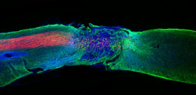 然后,这些小鼠被放下来检查治疗对细胞水平的影响,研究小组发现脊髓得到了极大的改善。被切断的神经元延伸部分轴突再生,而可以作为再生物理障碍的疤痕组织被大大减少了。更重要的是,为受伤细胞输送营养的血管已经形成,让更多运动神经元存活下来。