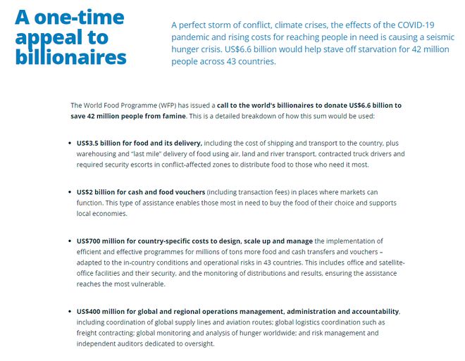 世界粮食计划署呼吁全球亿万富翁捐赠66亿美元,让4200万人免于饥荒。以下是这笔钱将如何使用的详细明细: