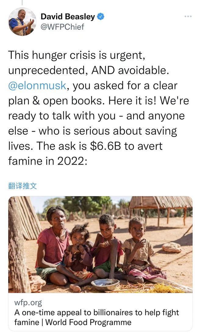 11月16日消息,当地时间周一,联合国世界粮食计划署负责人通过个人社交媒体Twitter向特斯拉首席执行官埃隆·马斯克(Elon Musk)提交了一份关于如何帮助避免2022年出现饥荒的详细计划。此前世界首富马斯克要求世界粮食计划署解释,自己的捐款将如何帮助缓解全球饥饿问题。