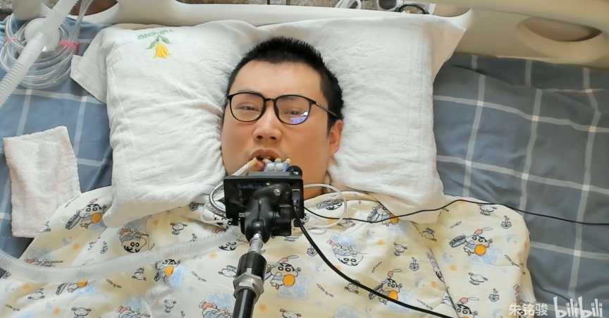 因为朱铭骏时刻要依靠呼吸机维持呼吸,要用嘴巴控制器来控制电脑。