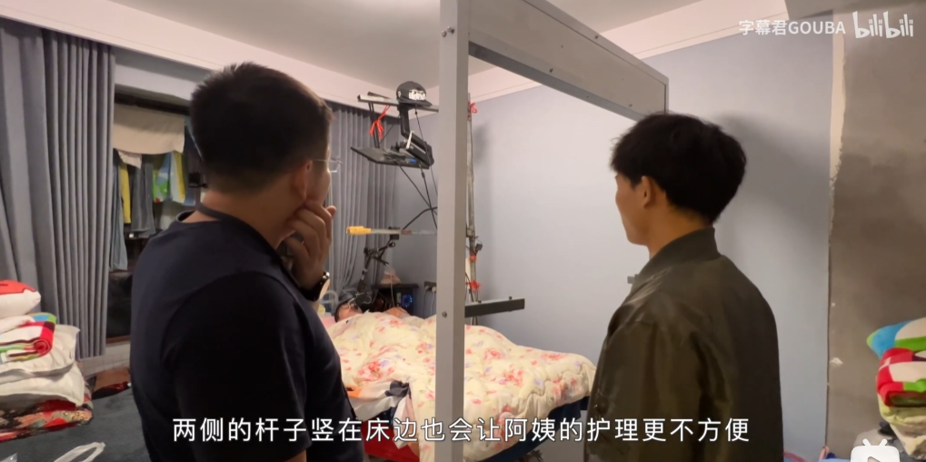因为房间太小,如果放了架子,朱铭骏妈妈的床就没法放。就算阿姨的床能硬挤进去,两边架子竖在旁边,阿姨做护理也不方便。