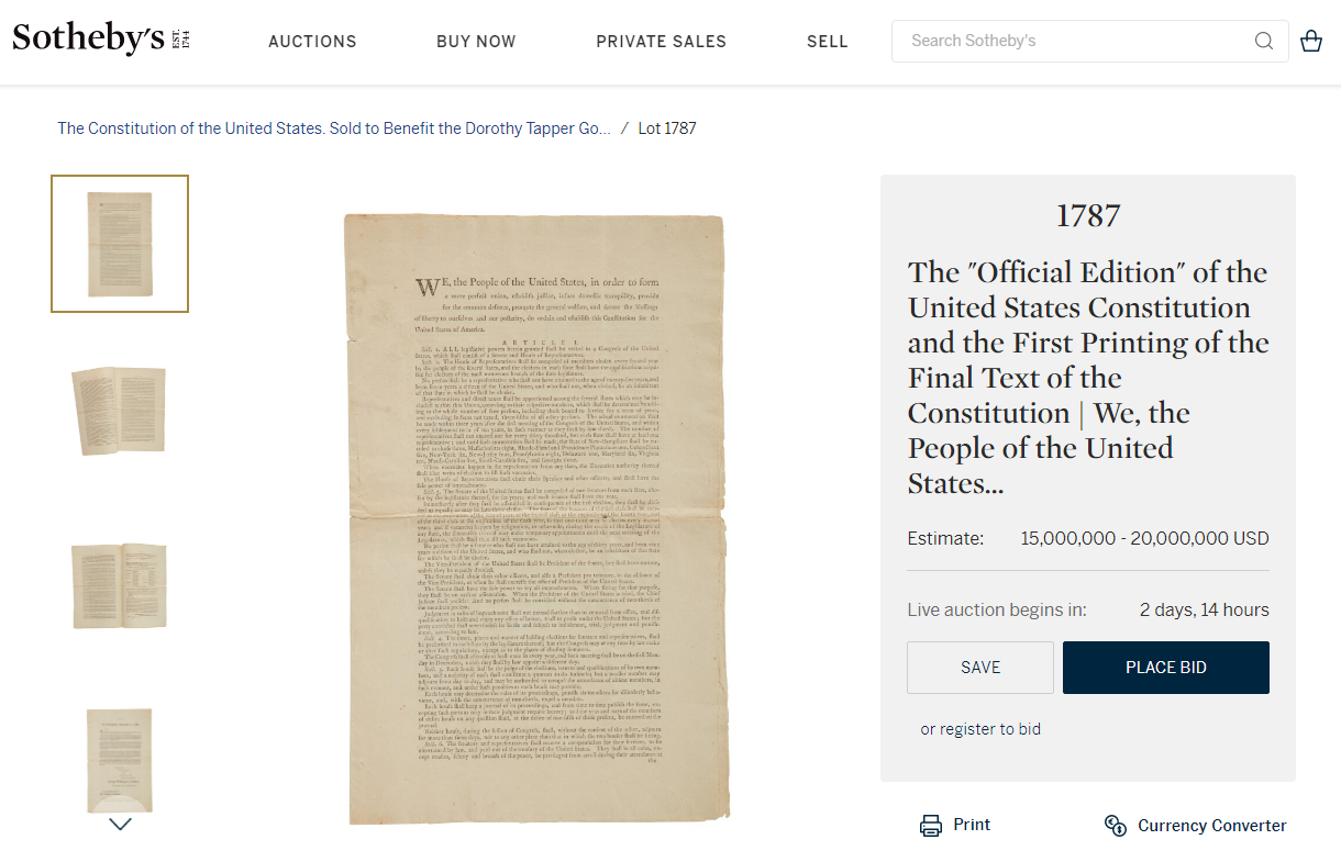 罕见的美国《宪法》第一版,现今仍有 12 份留存于世。不过 11 月 18 日的时候,苏富比将拍卖其中一份珍贵的副本。该机构宣称它比《独立宣言》的初版还要稀有,预估成交价格在 1500~2000 万美元左右。与此同时,为了参与竞标,一个名叫 ConstitutionDAO 的加密货币集团也正在努力筹措资金。