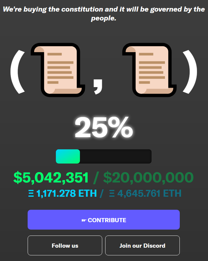 据悉,ConstitutionDAO 是个明确创建的组织,旨在拿到足够的资金来参与苏富比的竞拍。目前该组织正在以 ETH 这款加密货币来众筹,预设 2000 万美元的目标仅达成了 25% 。