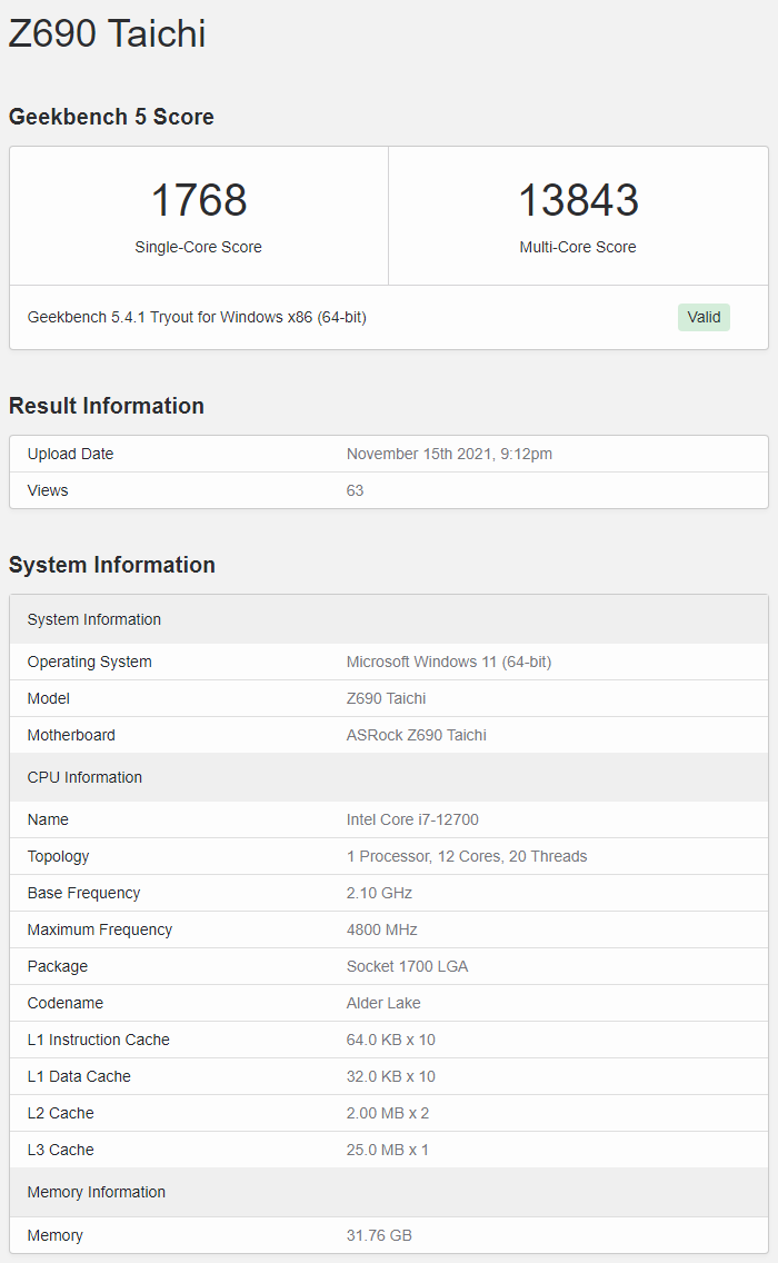 性能方面,i7-12700 的单核得分为 1768 / 多核得分为 13843 。与上一代 i7-11700 相比,其单核提升了 9% / 多核更是暴涨了 57% 。