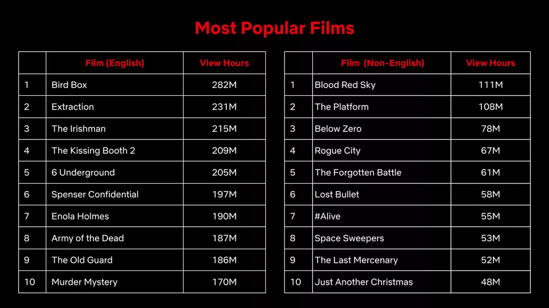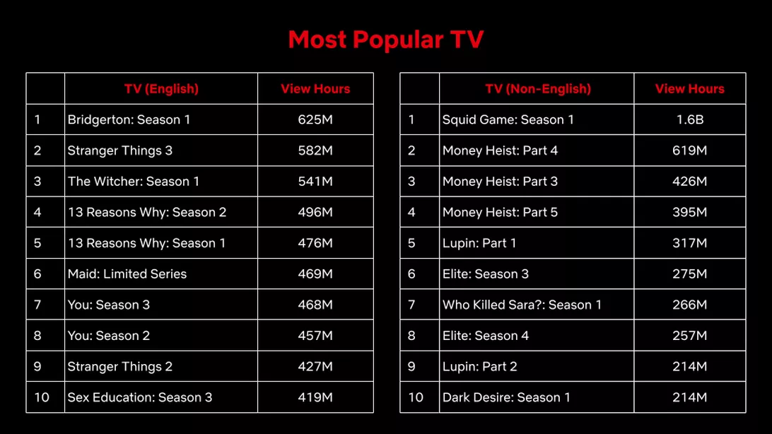 在这些图表中,有一个图表列出了Netflix上有史以来收视率最高的节目和电影并按英语和非英语语言的作品分类。