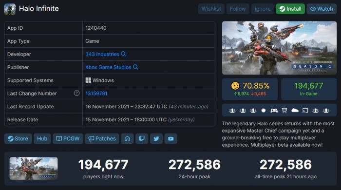 《光环无限》多人模式出人意料地提档前出,较既定计划早了一个月,而且……免费!SteAMDB录得PCU极值27万玩家同时在线,仅次于CS、Dota 2以及PUBG吃鸡,位列人气排行榜第四。