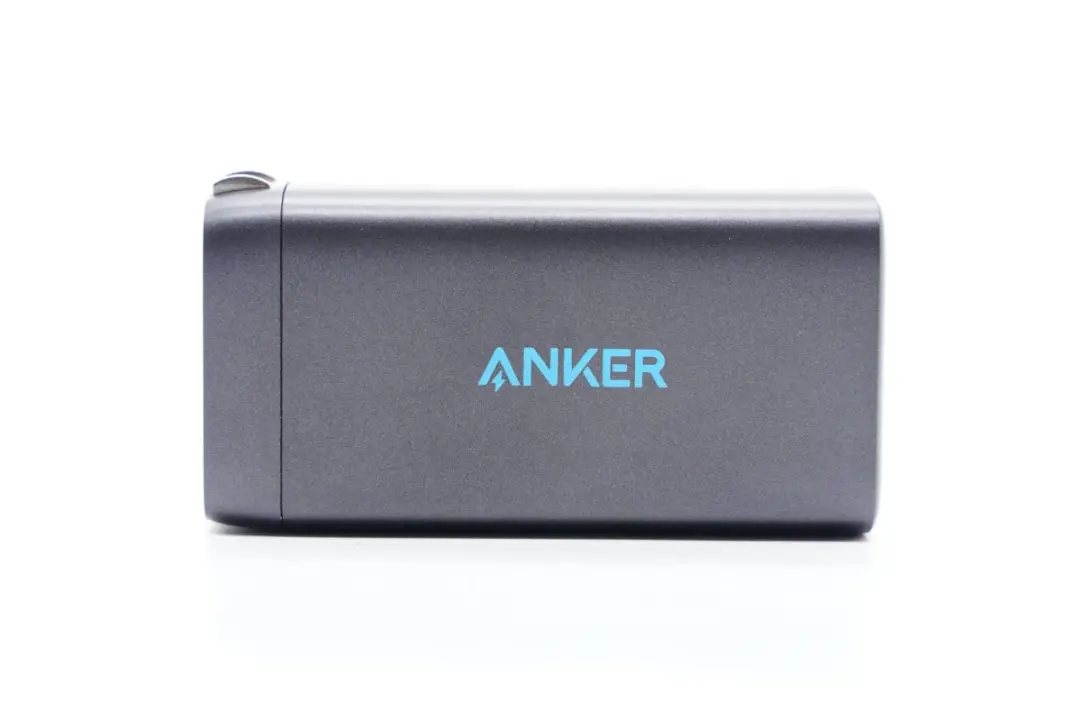 这款充电器采用长条形外观设计,黑色外壳,表面磨砂质感,正面居中印有ANKER的品牌logo。