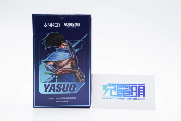 包装盒为蓝底,正面居中是YASUO的人物形象,上面为ANKER和英雄联盟的logo,下方是产品名称。
