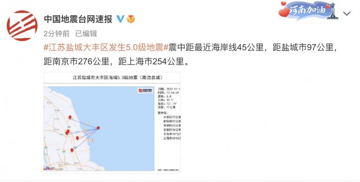 中国地震台网正式测定:11月17日13时54分在江苏盐城市大丰区海域(北纬33.50度,东经121.19度)发生5.0级地震,震源深度17千米。地震造成江苏盐城、南通等地震感强烈,江苏南京、上海等地亦有震感。 震中距最近海岸线45公里,距盐城市97公里,距南京市276公里,距上海市254公里。