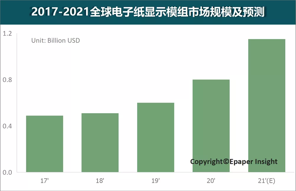 综上,虽然电子纸产品应用领域众多,但目前市场主要集中在电子价签、电子纸阅读器和记事本三大应用领域。根据CINNO Research旗下Epaper Insight《电子纸行业市场发展报告》中统计数据显示,2020年全球电子纸显示模组产品市场规模约为8亿美元,而前三大应用领域市场占比超95%以上。Epaper Insight预测,2021年全球电子纸显示模组市场规模将超过11亿美元,同比增长幅度将超40%以上。