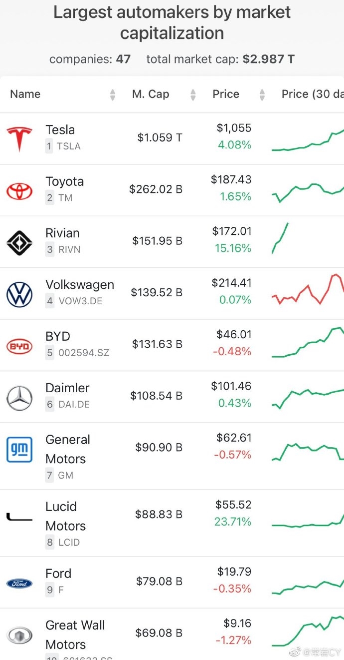 而大众、比亚迪、奔驰母公司戴姆勒、通用、Lucid、福特、长城汽车等车企,分列第四至第十。