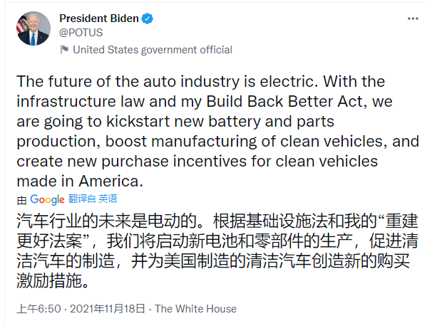 拜登还发布推文称:“汽车行业的未来属于电动汽车。在基础设施法案和我的《重建美好未来法案》支持下,我们将启动新的电池和零部件生产,促进清洁汽车的制造,并为美国制造的清洁汽车制定新的购买激励方案。”