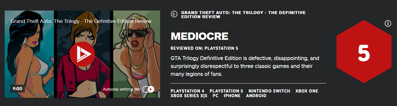 ING为《GTA:三部曲》重制版给出了5分的低分,并认为这是一款有缺陷的,令人失望的,并且不尊重这三款经典游戏及其众多粉丝的作品。