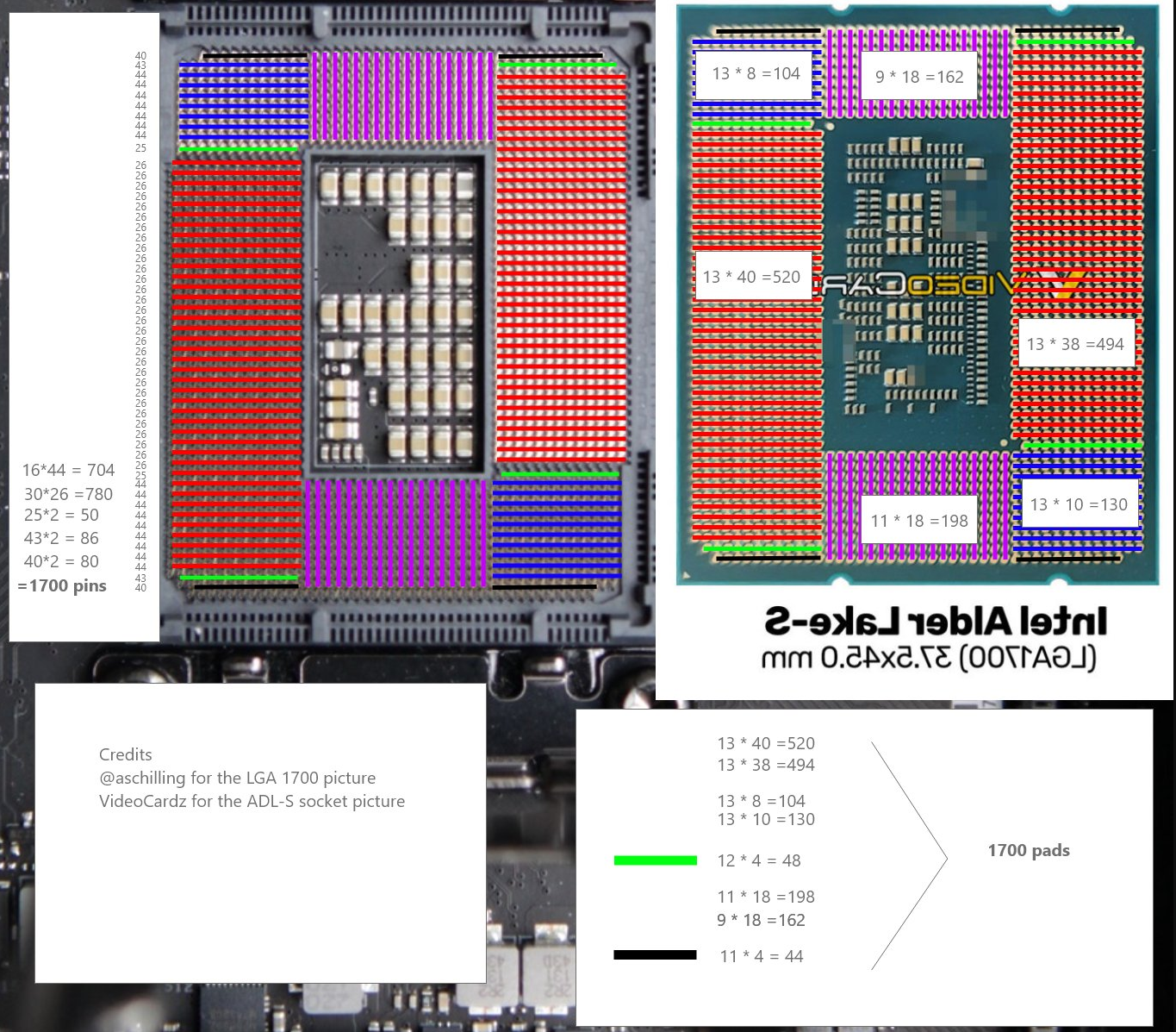 问题来了,LGA1700插槽真的是1700个针脚吗?这事还真有人去核对了,推特网友Olrak较真了一下,他实际数了一下LGA1700插槽的针脚数,得出结论是全新的插槽就是1700个针脚。