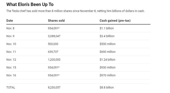 马斯克信守了诺言,仅仅几天后就开始抛售特斯拉股票。两周后,马斯克已经出售了大约820万股特斯拉股票,价值约88亿美元。其中,大约有60亿美元进入了这位向来以现金匮乏著称的亿万富翁口袋,另外约30亿美元被用来缴纳因行使部分股票期权而应缴的税款。
